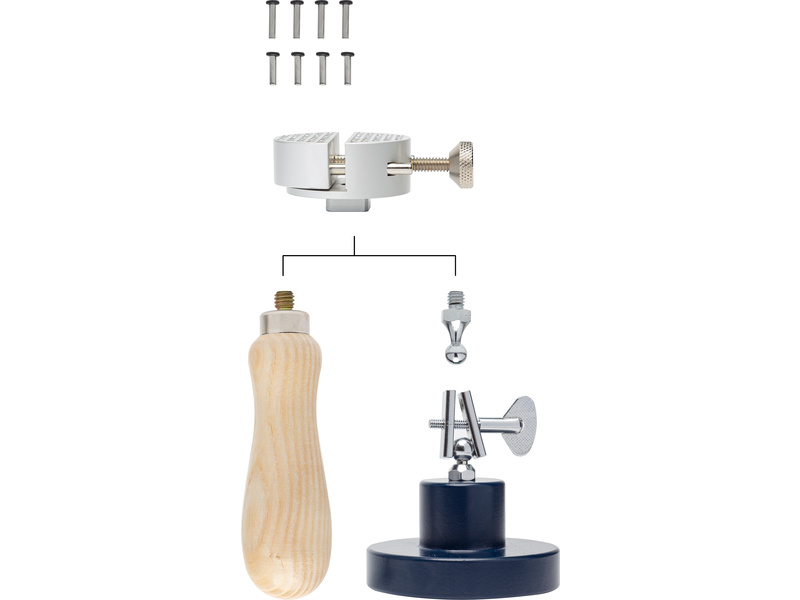 Modelcraft univerzální držák je určen pro držení menších součástí při malování, řezání, rytí nebo lepení. Upínací hlava o průměru 50 mm může být odstraněna ze základny a v případě potřeby namontována na větší stolní svěrák. Dřevěná rukojeť je opatřena vestavěným pryžovým kroužkem, který zajišťuje stabilní držení. Kolíky lze použít pro ohýbání a tvarování drátu. Sada obsahuje 8 ocelových kolíků, které mohou být umístěny kdekoli na hlavě. Základna 504g je vybavena zabudovaným gumovým kroužkem, díky kterému je pracovní držák stabilní a neklouzavý. Na základnu se připevní kulový čep pro vysokou variabilitu naklonění základny.