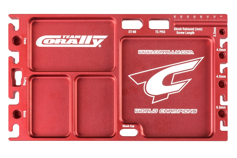 Masivní hliníková multifunkční deska je skvělý pomocník při servisu Vašich RC modelů aut. Obsahuje 4 přihrádky na drobné díly, držáky konektorů, držáky tlumičů a pístnic tlumičů a měřidlo. Povrch je červeně eloxovaný.