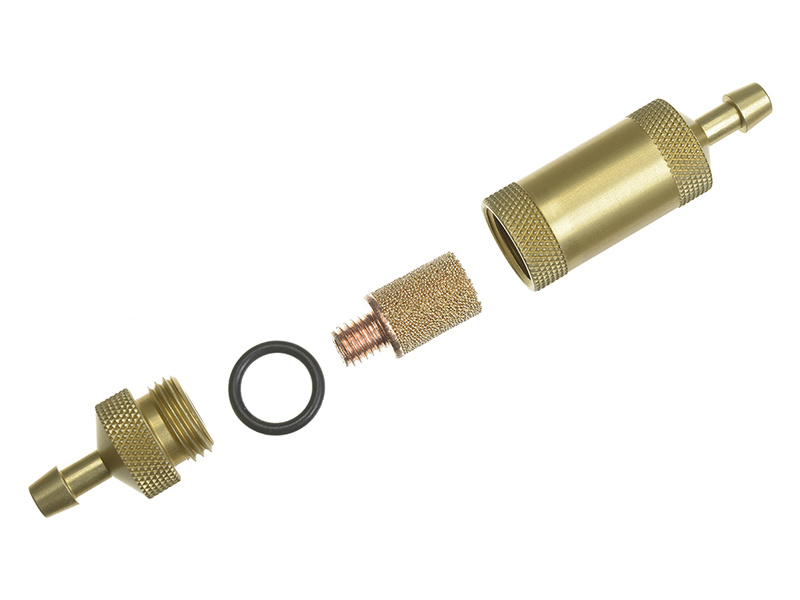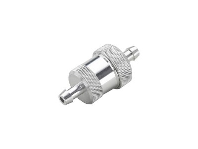 Palivový filtr s jemným sítkem filtru, hliníkový. Rozměry: délka celk. 49mm, průměr 12mm, hadicová koncovka 5/3,5mm, délka těla filtru cca 31mm.