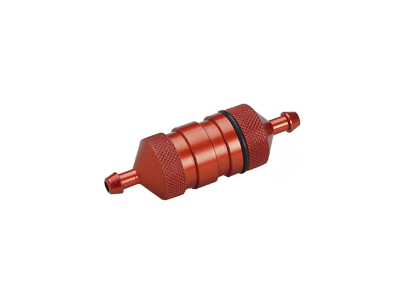 Palivový filtr velký s jemným sítkem filtru, hliníkový. Rozměry: délka celk. 40mm, průměr 19mm, hadicová koncovka 6/4,8mm, délka těla filtru cca 22mm.