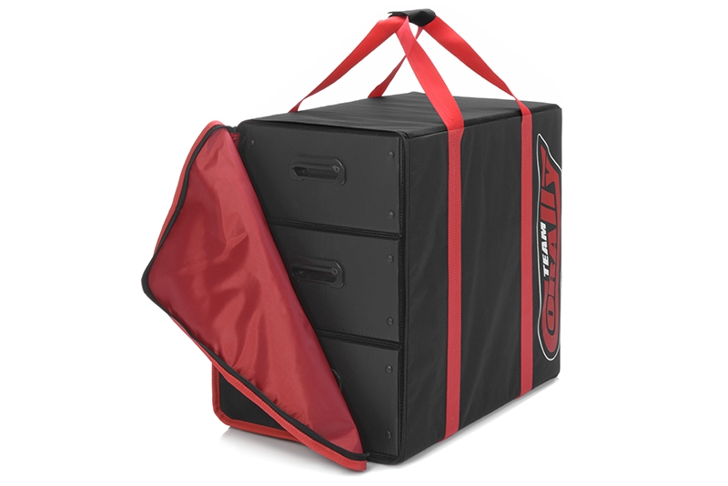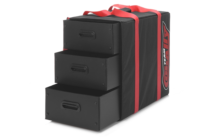 Přepravní taška se dvěma šuplíky pro přepravu příslušenství k RC autům nebo jeho příslušenství. Rozměr šuplíku 30 x 48 x 15 cm, rozměr tašky je 54 x 51 x 33 cm. Šuplíky jsou vyrobeny z plastového kartonu. Úchyty šuplíků jsou vyrobeny z plastového výlisku. Každý šuplík je vsazen do kartónového obalu, čímž je zamezeno jeho vysypání.