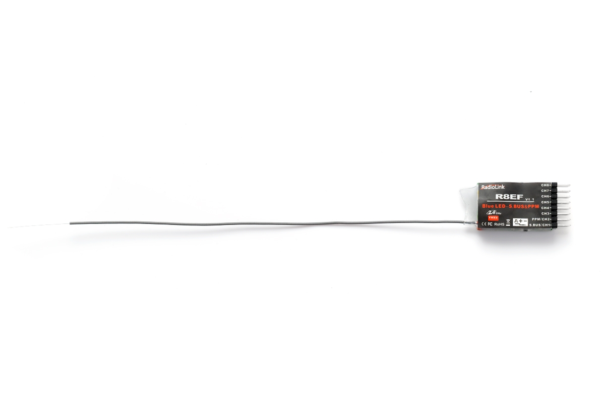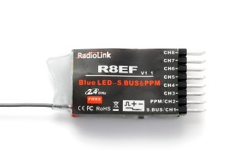 Radiolink R8EF 2,4GHz je 8-kanálový přijímač FHSS s frekvenčním přeskokem kompatibilní s vysílači Radiolink T8FB a T8S. NENÍ kompatibilní s vysílači Radiolink AT9S a AT10 II. Nabízí dva provozní režimy – se standardními šířkově modulovanými (PWM) signálovými servo výstupy (8 kanálů) nebo se sériovými výstupy S-BUS+PPM (8 kanálů).