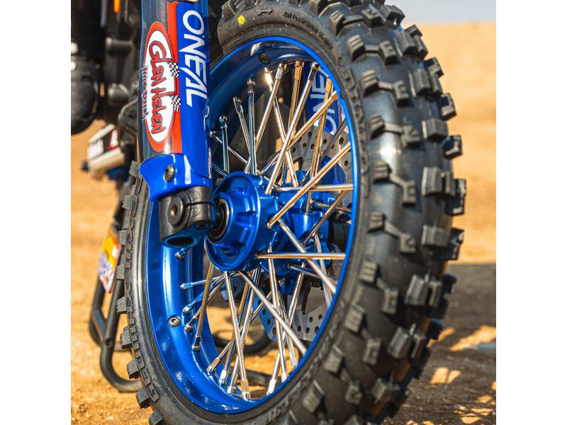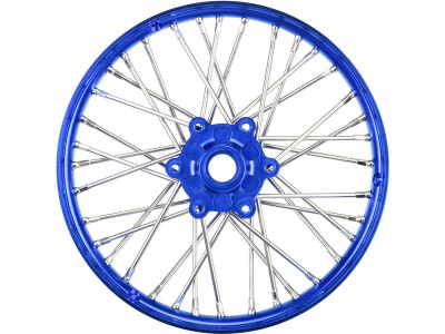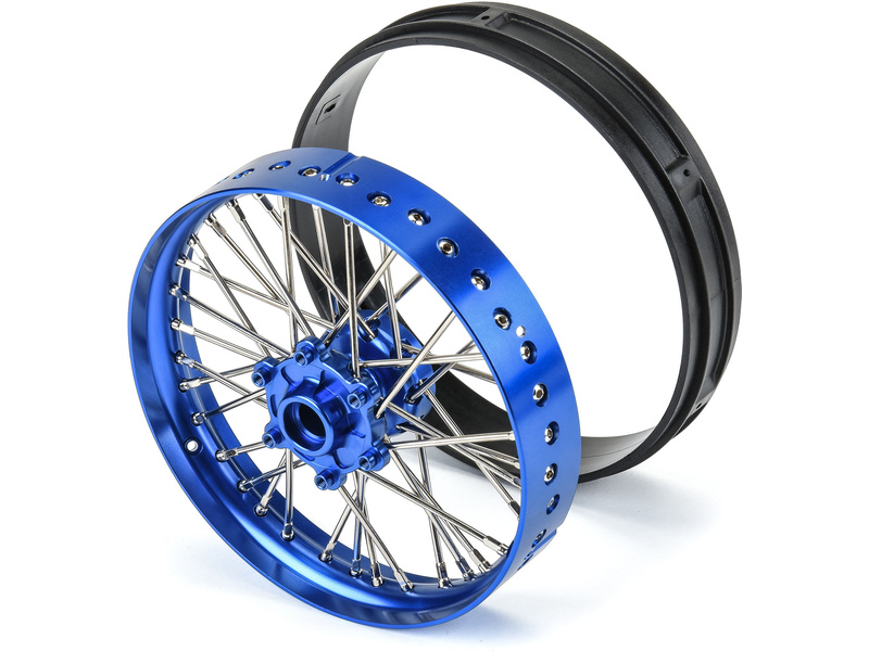 Tuningový díl pro RC modely motorek Losi Promoto-MX: Pro-Line disk přední Pro-Spec V2 Bead, hliník, modrý/modrý. Smontovaný disk s eloxovaným hliníkovým paprskovým kolem, pozinkovanými ocelovými paprsky a montážním příslušenstvím.