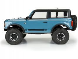 Pro-Line karosérie čirá Ford Bronco 2021, pro RC modely aut Crawler v měřítku 1:10, rozvor 290mm, délka 439mm, šířka 180mm. Vyrobeno z odolného lexanu. Včetně lisované černé plastové přední masky, blatníků, zrcátek, klik dveří, stěračů a držáku náhradního kola
