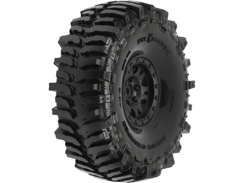 Kompletní kola Pro-Line pro RC modely aut 1:10, Crawler, expediční. Rozměr ⌀140x49 mm. Paprskový disk Impulse má černou barvu. Pneumatiky Interco Bogger G8 1.9", tvrdost směsi G8 (měkká). Unašeč je šestihran 12 mm.