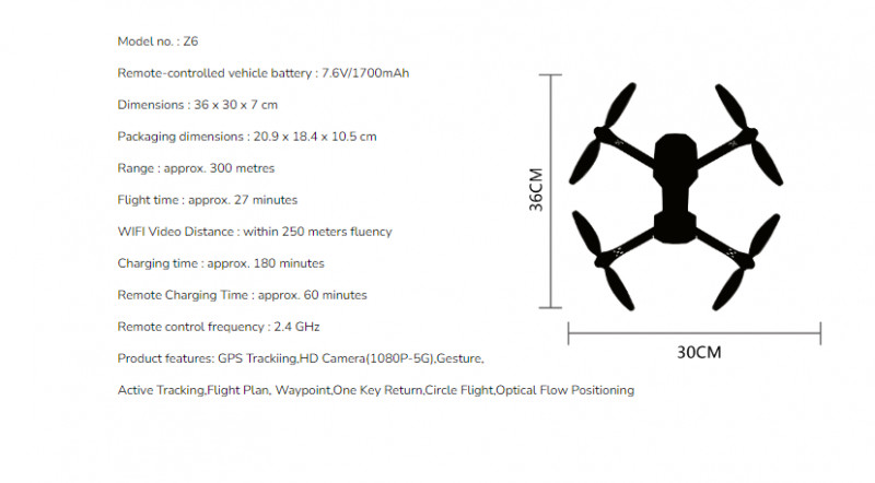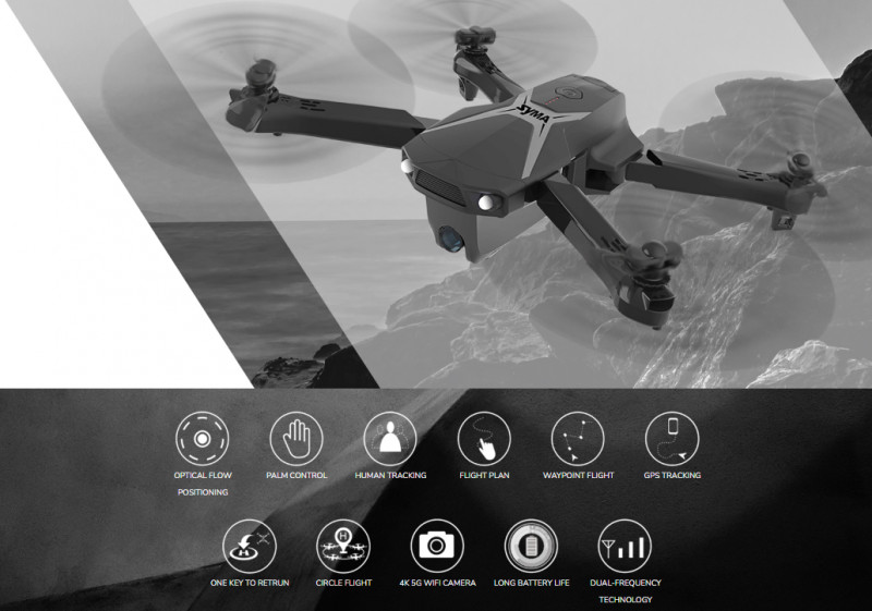 Syma Z6 - skládací dron s GPS a 4K kamerou, frekvence 5G nebo 2,4 GHz, designová brašna, ovládání gesty, follow me, kroužení kolem pevného bodu, možnost naplánovat trasu, funkce kruhového letu, funkce návratu, letový dosah cca 450 m do dálky, do výšky 100 m.