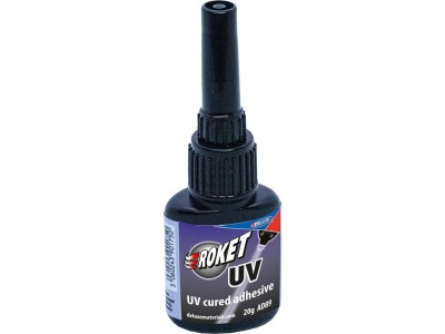 Lepidlo Roket UV od Deluxe Materials patří mezi lepidla, které se vytvrzují UV zářením. Roket UV vytváří zcela čirý spoj, lepí tvrdé plasty, kompozitní materiály, dřevo a kovy.