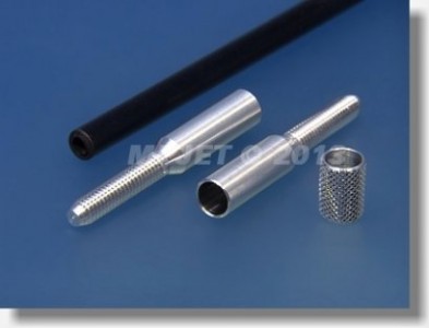 Set pro vytvoření táhla s funkcí jako napínák - 1 ks koncovky táhla Al pro carbon trubku pr.4 se závitem M2 pravým, 1 ks koncovky táhla pro carbon trubku pr.4 se závitem M2 levým, 1 ks nastavovacího kroužku pr.4.