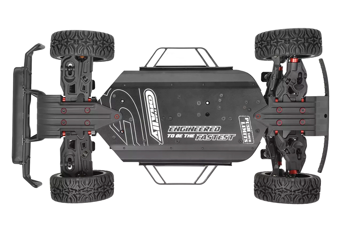 Jádrem modelu SHIROI je CNC frézované 3mm hliníkové plato podvozku, vyztužené vzpěrami a vysokými kompozitními bočními chrániči. Tato tuhá kostra je konstruována tak, aby s lehkostí zvládala jízdu ve vysoké rychlosti, drsný terén a náročné dopady. Neprůstřelné ocelové hnací ústrojí s CNC frézovanými ozubenými koly, třemi diferenciály naplněnými olejem a odolnými hnacími hřídeli CVD zajišťuje maximální účinnost a spolehlivost jak při napájení 4S, tak i 6S LiPo.