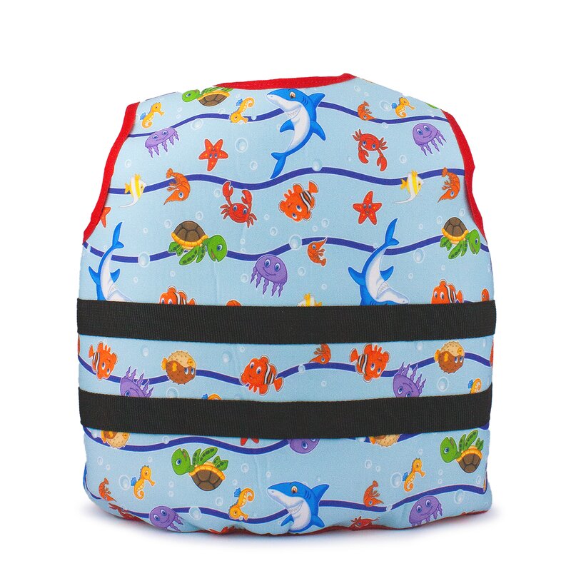 Barevná dětská plovací vesta pro neplavce, velikost L. Vesta má veselý potisk s postavičkami, zip a 2 popruhy pro bezpečné uchycení. Z vesty lze vyndavat polystyrenové vložky.