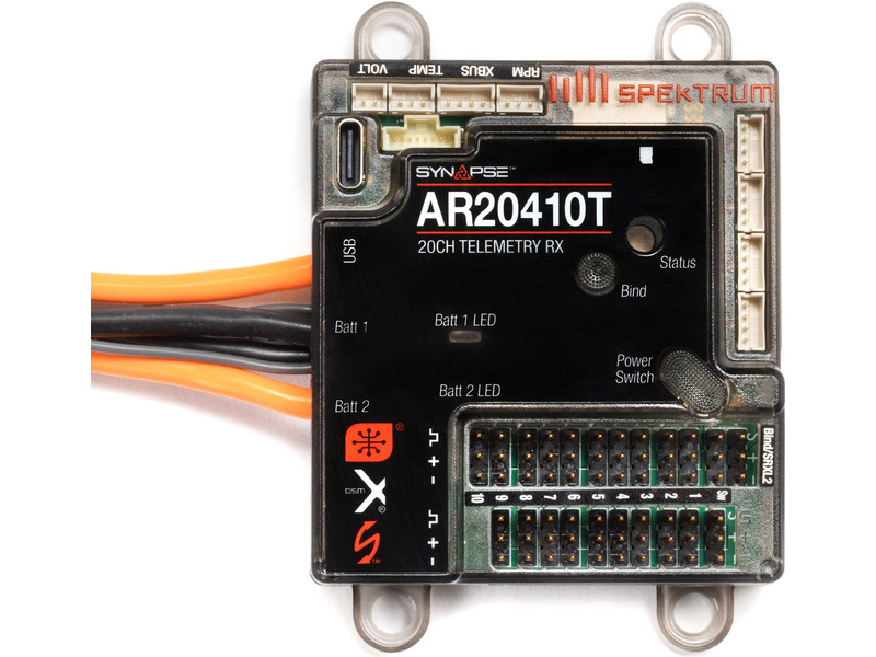 Převratnou funkcí přijímače AR20410T PowerSafe jsou vestavěné senzory, které zaznamenávají spotřebovanou kapacitou akumulátorů Smart. Přijímač má porty pro otáčky, napětí letových baterií a senzory teploty a také port X-Bus pro další externí telemetrie. Snadnou aktualizaci zaručuje USB-C port.