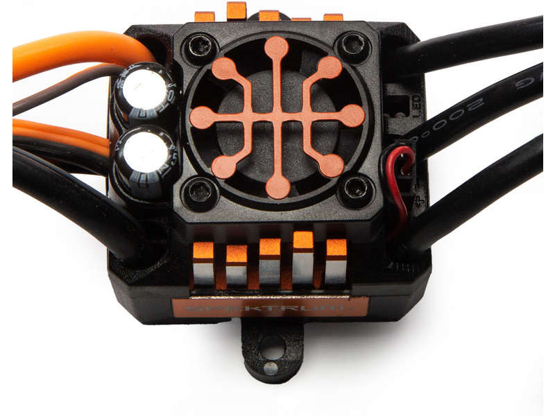 Elektronika regulátorů Spektrum Firma pro RC modely aut je kompletně zalita ve speciální zalévací hmotně, která brání vstupu vlhkosti či nečistot do elektroniky. Regulátor se zapíná a nastavuje tlačítky, které jsou pod pryžovým krytem.