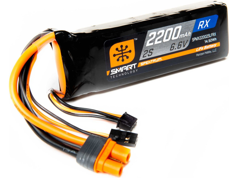 LiFe akumulátor Spektrum 6,6 V 2200 mAh s technologií Smart pro napájení RC přijímačů. Technologie Smart zjednodušuje a zrychluje nabíjení a prodlužuje životnost akumulátoru. Akumulátor je osazen konektory IC3 a přijímačovým JR.