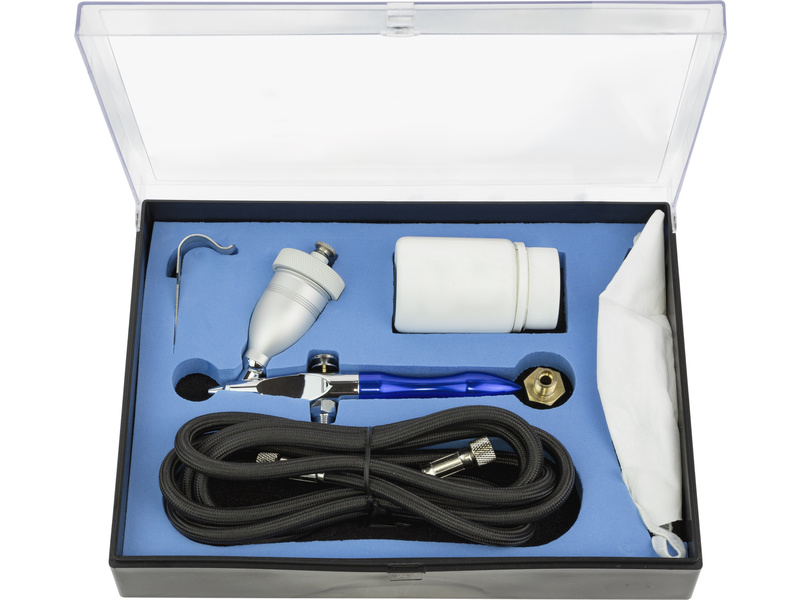 V balení je pistole, s dávkovací nádobou, držák pistole, hadice se šroubením, láhev se 100 g korundového abraziva a obličejová rouška.