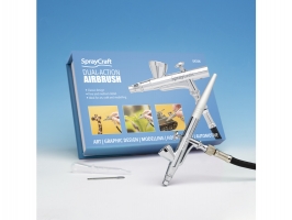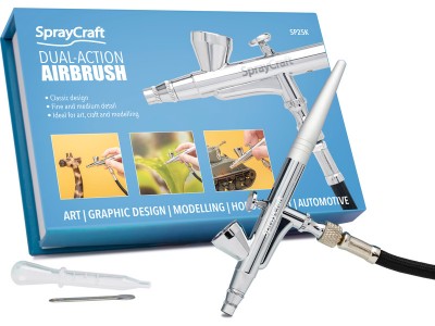 Spraycraft airbrush stříkací pistole SP25 je dvoučinná, stiskem spouště se uvolní vzduch a pohybem dopředu nebo dozadu se volí množství barvy. Nádobka 2 ml s víčkem je v horní části, tryska o průměru 0,3 mm.