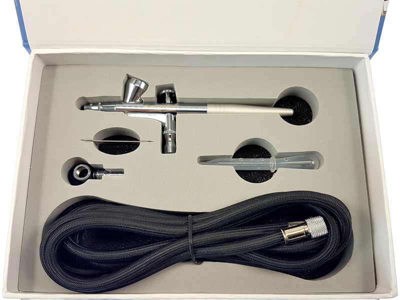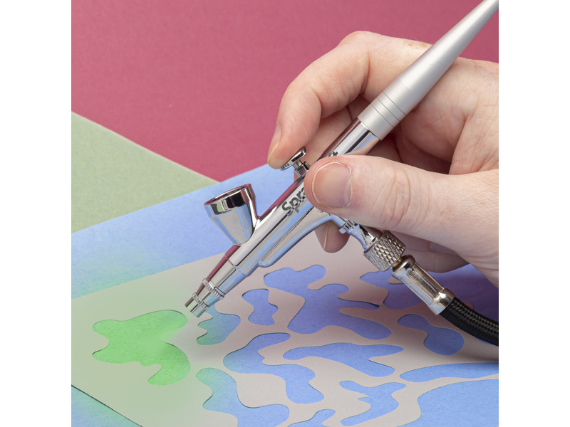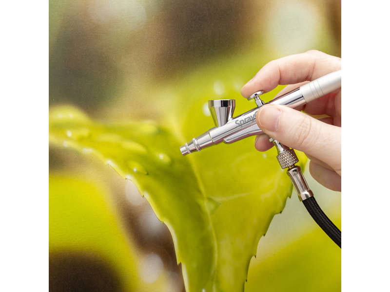 Spraycraft airbrush SP25 je kvalitní celokovová dvoučinná stříkací pistole, kdy se stiskem spouště uvolní vzduch a zpětným pohybem se uvolní množství barvy. Nádobka o obsahu 2 ml je v horní části, tryska má průměr 0,3 mm. Pro Art, hobby, umění a grafiku. Provozní tlak je 15 až 50 PSI (1.0 až 3.5 bar). Hadice je osazena převlečnými maticemi s trubkovým závitem 1/8".