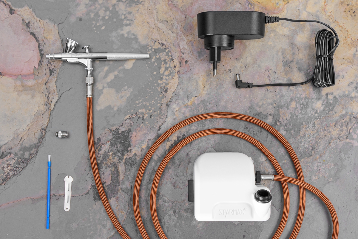 Součástí setu je dvoučinná pistole HB-040 (balení obsahuje adaptér pro přestavbu na jednočinnou), kompresor DC-25, síťový adaptér a příslušenství pro připojení.