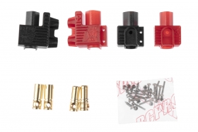 Zlacené 7mm konektory s domkem pro montáž do rámu vrtulníků SAB Goblin 700 Pro/RAW/KSE. Zastrčením pohonné baterie do slotu dojde k zapojení konektorů. Varianta s kolmým přívodem kabelu do k...