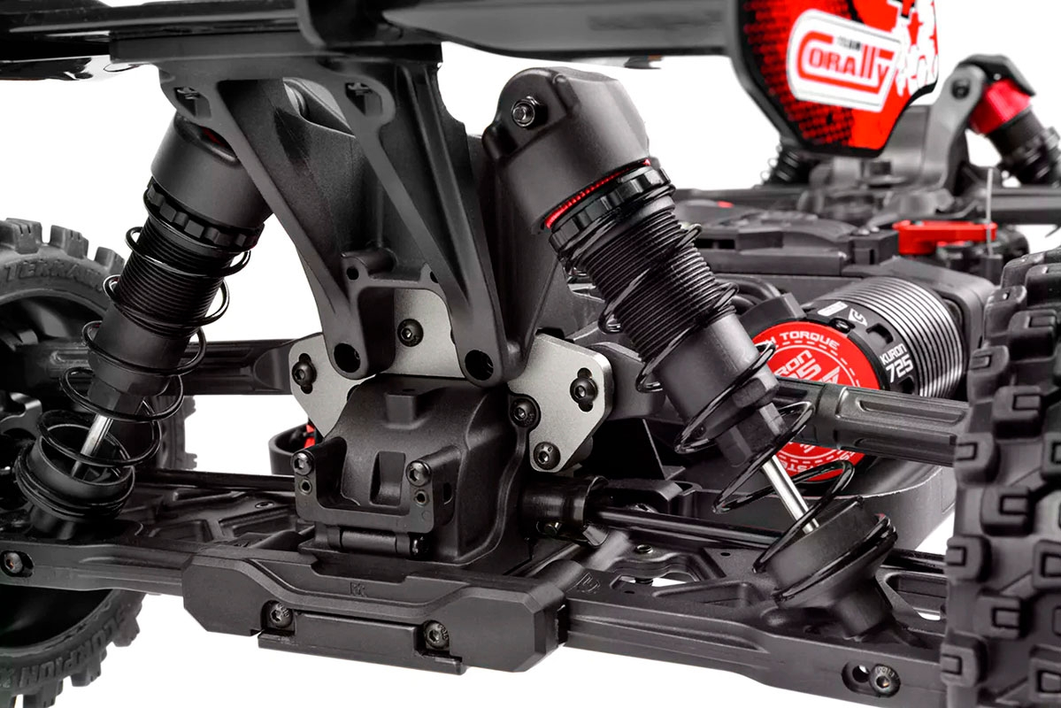 Team Corally se u podvozku modelu Syncro4 vůbec nedrží zpátky. Díky využití dobře známých a otestovaných ramen zavěšení z předchozích modelů, jako jsou Radix6 a Sketer, spolu s robustními předními a zadními těhlicemi zajišťuje Syncro4 špičkový výkon v jakémkoli terénu. Díky zařazení 4mm CNC frézovaných držáků ramen známých z modelu Spark XB6 a precizně zkonstruovaných linků (řízení, serva a zadních horních ramen) si model Syncro4 zachovává odolnost a bezkonkurenční výkon. I po zavedení nových plastových tlumičů a parohů si Team Corally pevně stojí za tím, že přináší systém odpružení, který nedělá kompromisy v kvalitě, odolnosti ani výkonu.