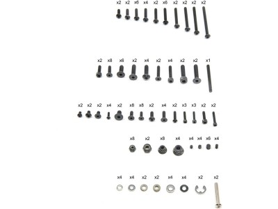 Sada imbus šroubků a matiček značky TRL. Šroubky jsou v různých délkách, průměrech, se zapuštěnou hlavou, půlkulatou hlavou, válcovou hlavou.