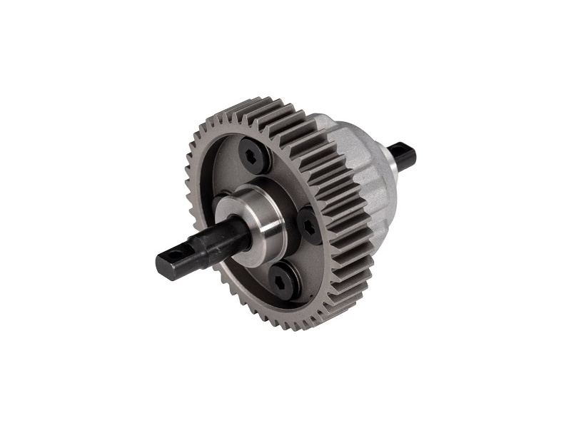 Traxxas diferenciál centrální - kompletní, hliníkový pro lepší odvod tepla, vysokou odolnost a výbornou distribuci výkonu, ocelové čelní ozubené kolo, 44 zubů, modul ozubení M1, naplněný vazelínou 20M cSt. Diferenciál zvyšuje trakci předních kol.