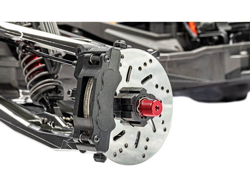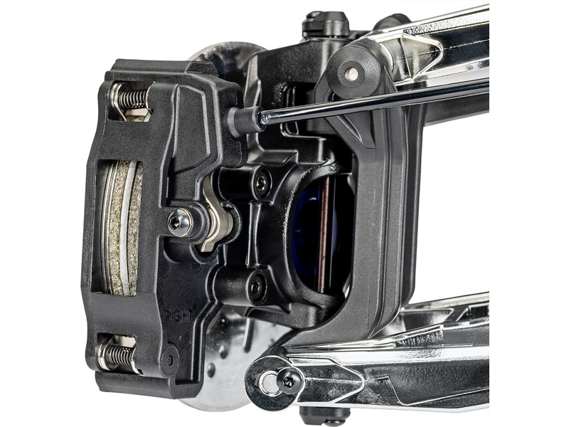 Výkonné přední kotoučové brzdy spolupracují se zadním brzděním pomocí motoru a zajišťují silný a kontrolovaný brzdný výkon na všech čtyřech kolech. Brzdové destičky v třemenech svírají nerezový kotouč, který je pro maketový vzhled opatřen chladícími otvory. Brzdy jsou ovládány servem přes bowdeny.