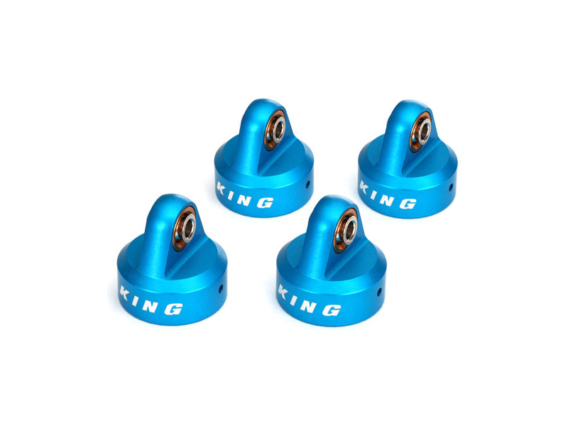 Hlava tlumiče Traxxas, hliníková modrá s motivem King, 4ks. Tuningový díl pro model Unlimited Desert Racer.