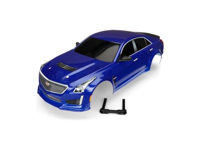 Karoserie Traxxas Cadillac CTS-V modrá. Hotová nabarvená karoserie s potisky je tuning pro RC modely aut Traxxas na podvozku 4-Tec 2.0 1:10, 4-Tec 2.0 Ford GT 1:10 a 4-Tec 2.0 Ford Mustang GT 1:10.