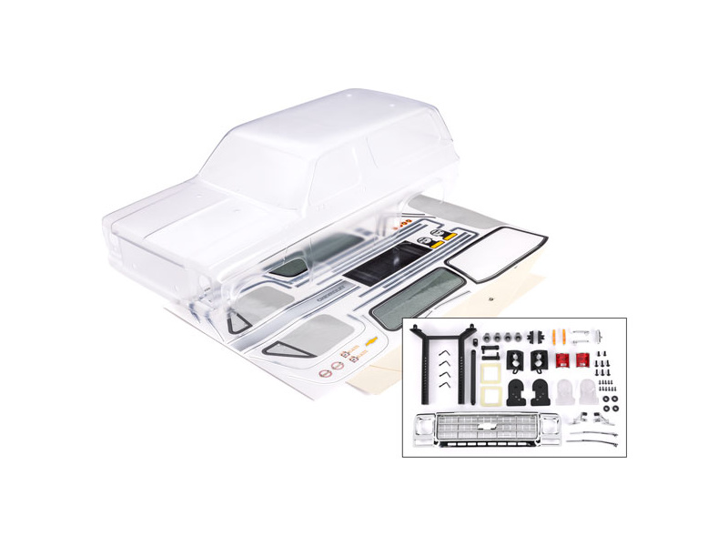 Traxxas karosérie Chevrolet Blazer 1979 čirá. Ořezaná, vyžaduje barvení. Včetně maketového příslušenství, masky oken a archu samolepek. Určeno pro šasi s rozvorem 312 mm.