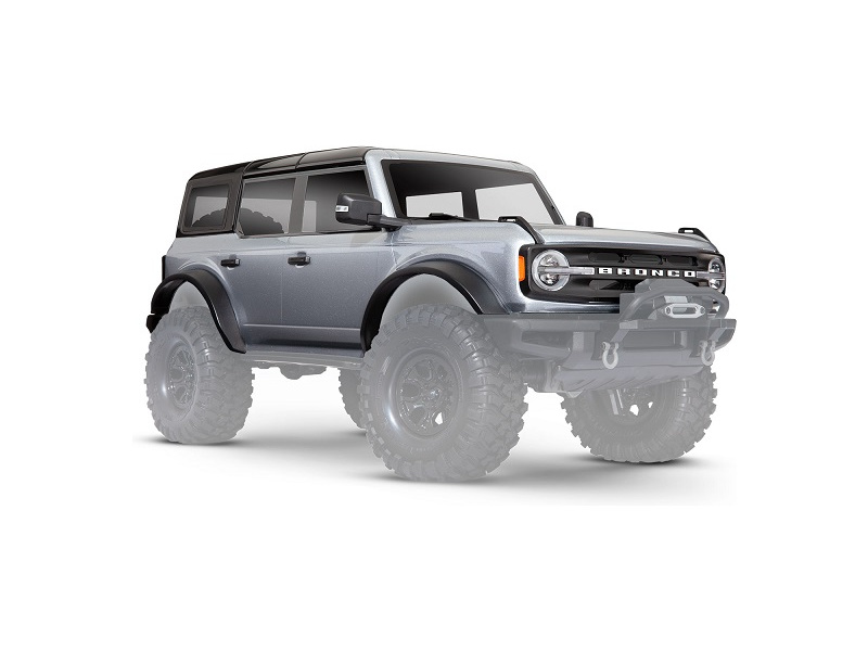 Traxxas karosérie Ford Bronco 2021 stříbrná - kompletní nabarvená. Určeno pro RC model Traxxas TRX-4 Ford Bronco 2021 nebo jiné modely TRX-4 s rozvorem 324 mm / konverzní sadou a s instalovanými blatníky pro bez-sponkové upínaní karoserie.