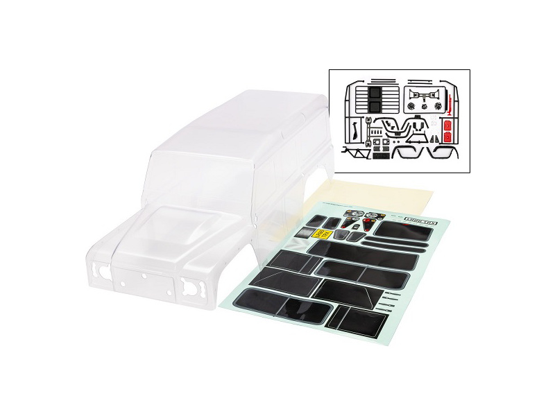 Traxxas karosérie TRX-4 Land Rover Defender čirá (bezsponková). Vyžaduje barvení. Včetně přední masky, zrcátek, klik dveří, střešního nosiče a rezervníko kola. Arch samolepek, maska oken, bezsponkový držák. Kompatibilní s rozvorem 324 mm.