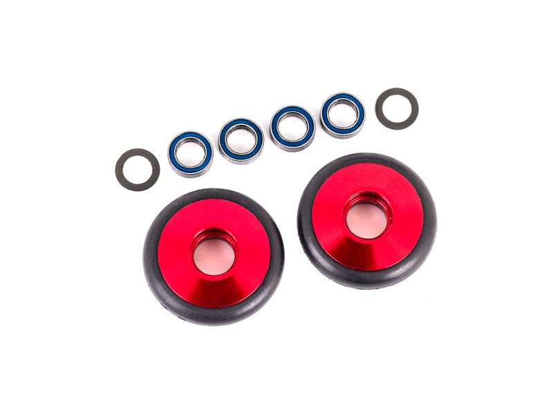 Tuningová kola wheelie z vysoce pevnostního hliníku 6061-T6 s designovým červeným eloxováním a gumovým kroužkem (2 ks), 4x kuličková ložiska 5x8x2.5 mm, 2x podložka 5x8x0.3 mm.