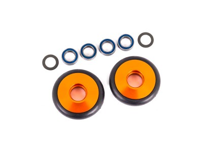 Tuningová kola wheelie z vysoce pevnostního hliníku 6061-T6 s designovým oranžovým eloxováním a gumovým kroužkem (2 ks), 4x kuličková ložiska 5x8x2.5 mm, 2x podložka 5x8x0.3 mm.