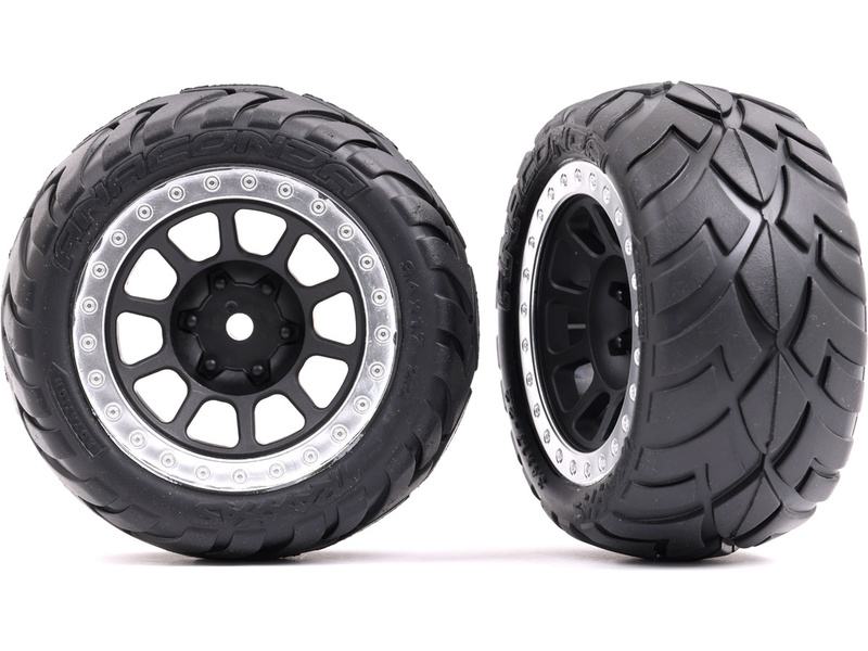 Kompletní zadní kola pro auta 1:10 (Bandit). Disk šedý/chromovaný. Pneumatiky Anaconda.