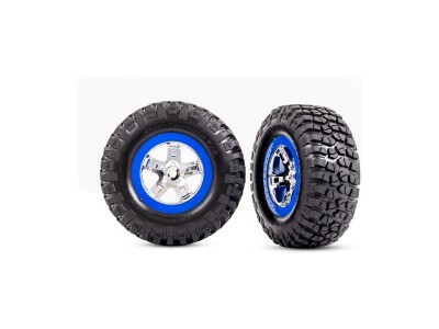 Kompletní zadní kola pro 2WD, přední i zadní pro 4WD auta Traxxas Slash. Chromované disky s modrými ráfky a nalepenými pneumatikami BFGoodrich® s vložkou. Rozměr disku 61/81x42 mm. Celkový rozměr 110x46 mm. Unašeč je šestihran 12 mm s offsetem 24 mm.