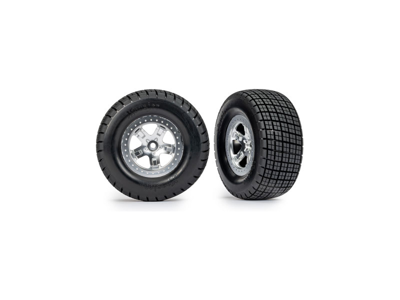 Kompletní univerzální kola (2WD přední), pro RC auto Traxxas Slash Mudboss. Disk SCT polomatný chrom 2.2/3.0", s nalepenou pneumatikou Hoosier a pěnovou vložkou. Unašeč je šestihran 12 mm.