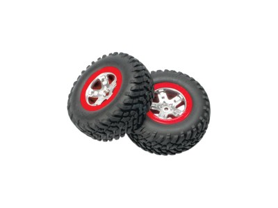 Kompletní zadní kola pro 2WD, přední i zadní pro 4WD auta Traxxas Slash. Chromované disky s červenými ráfky a nalepenými pneumatikami BFGoodrich® s vložkou.
