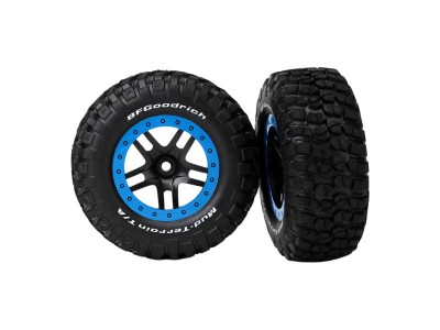 Kompletní zadní kola pro 2WD, přední i zadní kola pro 4WD RC auta Traxxas Slash. Disky Split Spoke černé se modrými ráfky, nalepené pneumatiky Goodrich KM2 Mud Terrain.