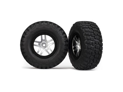 Kompletní zadní kola pro 2WD, přední i zadní pro 4WD RC auta Traxxas. Stříbrný disk Split Spoke s pneumatikami BFGoodrich KM2 Mud Terrain a vložkou.