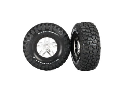 Kompletní zadní kola pro 2WD, přední i zadní pro 4WD RC auta Traxxas. Stříbrný disk Split-Spoke s černými ráfky s pneumatikami BFGoodrich KM2 Mud Terrain (S1 super měkká směs) s vložkou.