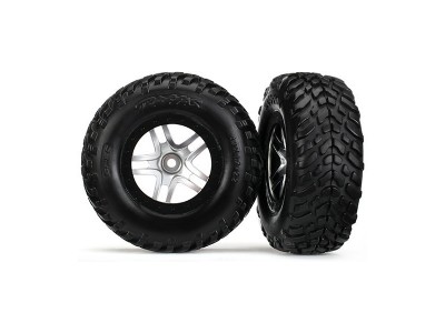Kompletní zadní kola pro 2WD, přední i zadní kola pro 4WD RC auta Traxxas Slash. Disky Split-spoke stříbrné se černými ráfky, nalepené pneumatiky SCT (S1 super měkká směs).
