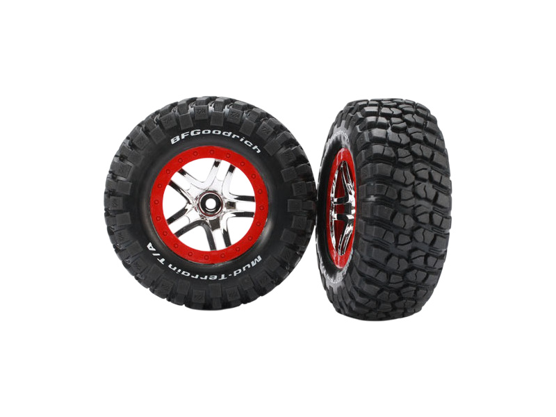 Kompletní zadní kola pro 2WD, přední i zadní pro 4WD RC auta Traxxas. Stříbrný disk Split Spoke s červenými ráfky s pneumatikami BFGoodrich KM2 Mud Terrain (S1 super měkká směs) s vložkou. Rozměr disku 61/81x42 mm. Celkový rozměr 110x46 mm. Unašeč je šestihran 12mm s offsetem 24 mm.