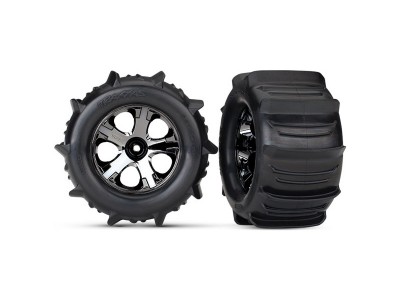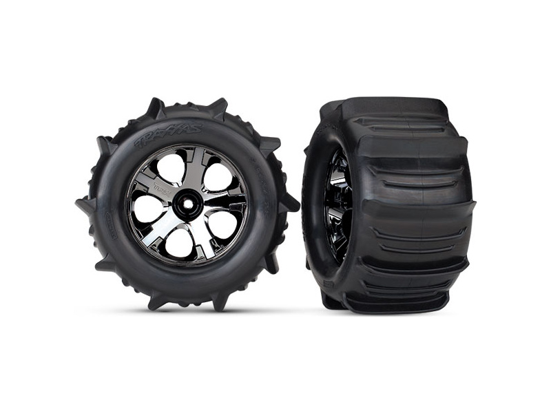 Kompletní kola All-Star. Černě chromované disky s lopatkovými pneumatikami pro RC modely aut v měřítku 1:10 (2 ks v balení). Paddle tires-lopatkové pneumatiky jsou vhodné do písku, sněhu nebo pro jízdu po vodní hladině.