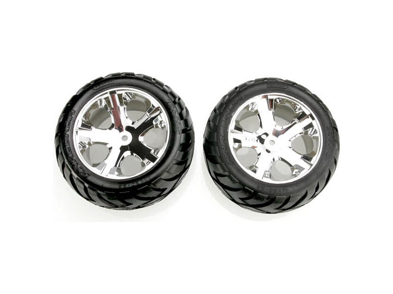 Kompletní kola pro RC auta. Chromované disky All-Star s vložkou a nalepenými pneumatikami Anaconda.