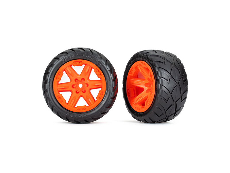 Kompletní univerzální kola pro RC auta. Disky RXT v oranžové barvě s nalepenými pneumatikami Anaconda a vložkou. Unašeč je šestihran 12 mm. Určeny pro 4WD přední/zadní, 2WD přední.