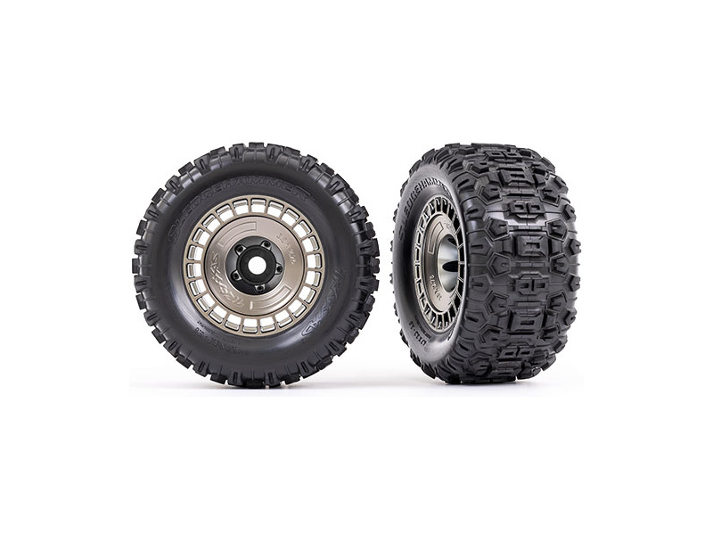 Traxxas kolo 3.8", pneu Sledgehammer, disk polomatný černě chromovaný s výměnnou poklicí. 2 ks. Pneumatiky, díky inspiraci motokrosem, poskytují extrémní trakci a kontrolu nad modelem. Možnost různého offsetu s volitelnou sadou #9567. Unašeč 17 mm šestihran - drážkovaný.