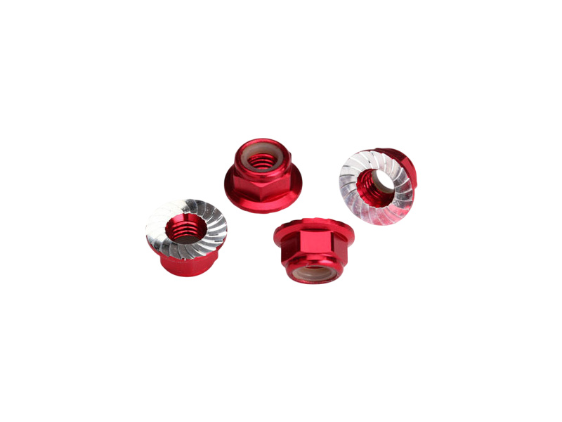 Náhradní díl pro RC modely aut 1:8 Traxxas Maxx, Desert Racer: Samojistná hliníková matice M5 s vroubkovaným límcem červeně eloxovaná. Balení obsahuje 4 ks.