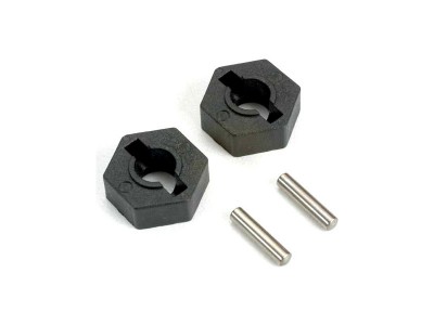 Unašeče disků kol s čepy. Unašeč šestihran 14 mm, tloušťka unašeče 5,5 mm, otvor pro hřídel o průměru 6 mm. Čepy průměr 2,5 mm, délka 12,5 mm. Unašeče jsou vyrobeny z plastového kompozitu.