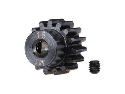 Traxxas pastorek na hřídel 5 mm s 15 zuby a modulem ozubení 1 mm pro RC modely aut. Vyrobeno z kalené nástrojové oceli. Součástí balení je červík.