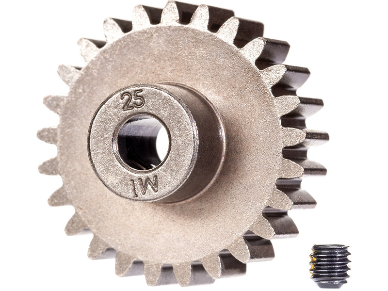 Traxxas pastorek na hřídel 5 mm s 25 zuby a modulem ozubení 1 mm pro RC modely aut. Vyrobeno z sintrované oceli. Součástí balení je stavěcí šroub.